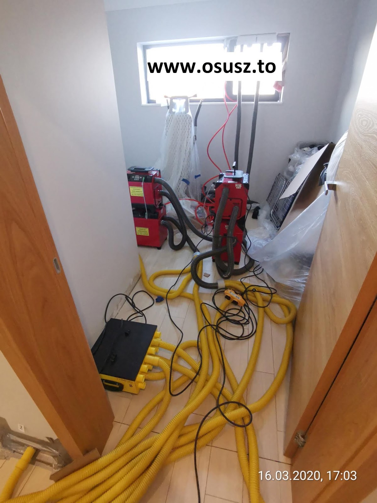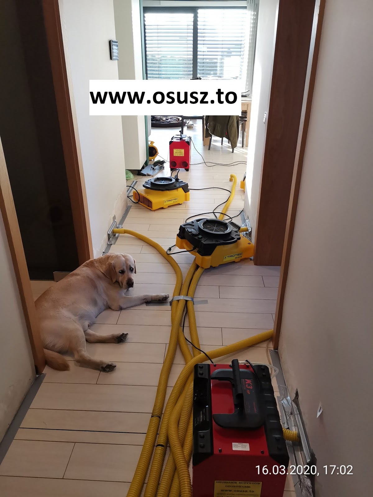 Osuszacze i wentylatory w akcji. Piesio pilnuje węży