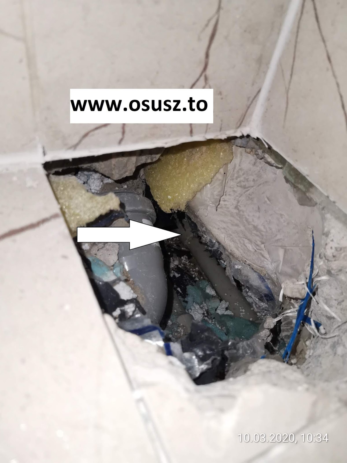Usterka została naprawiona przez Tomka, mojego współpracownika. Zrobił to genialnie. Nie rozbił ani jednej płytki. Rozbił ścianę w pokoju obok i dostał się do nieszczelności bez żadnego problemu.
